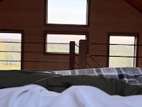 Welcome to our cozy yet spacious Poconos cabin, where rustic charm meets modern comfort. With 20' vaulted ceilings and warm wood interiors, this 2-bedroom, 2-bath retreat sleeps up to 8 guests. The lofted king master ensuite offers privacy while overlooking the open-concept living space below, and a second king bedroom on the main floor shares access to a full bath.