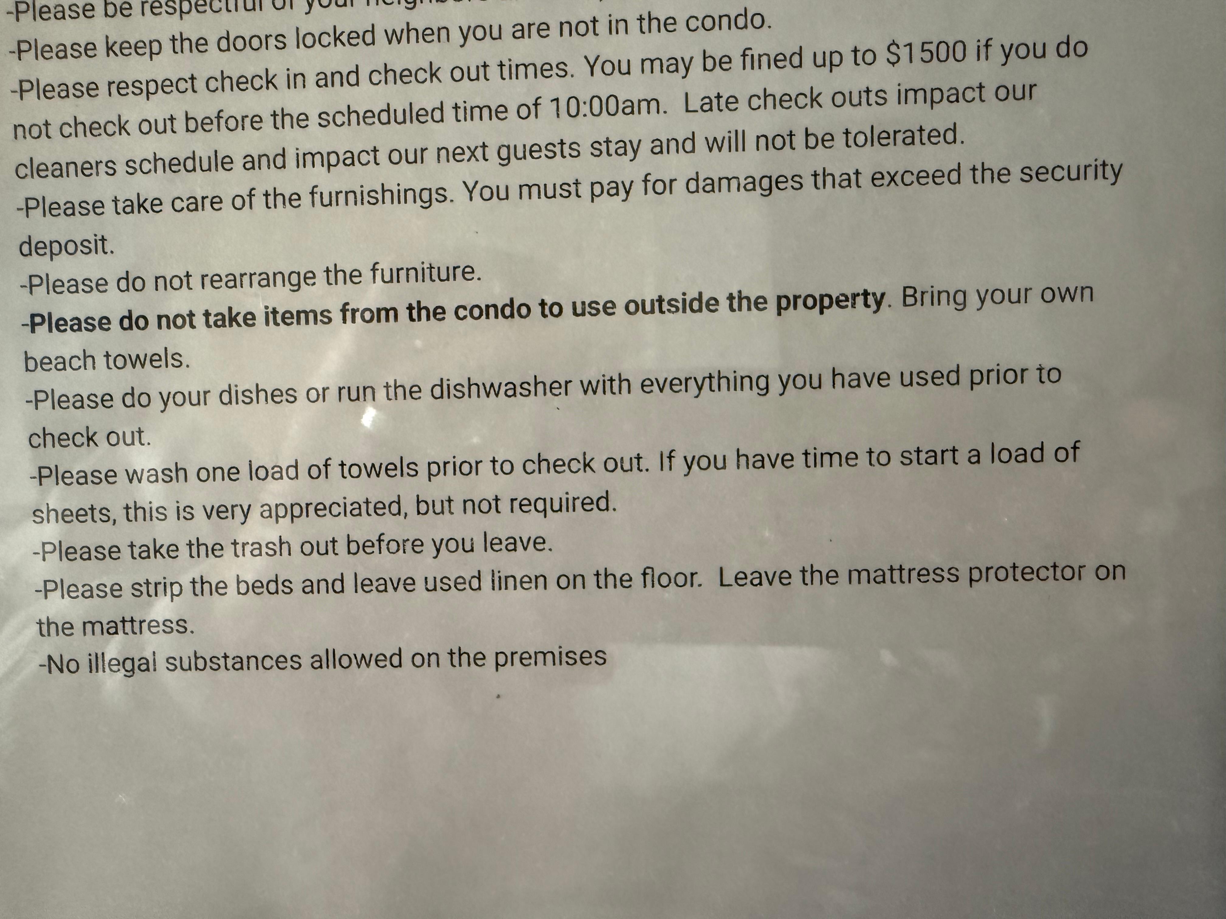 Guests are responsible to bring their own beach towels. Items, such as linens, towels, games, and cooking utensils, provided in the condo should not leave the property.