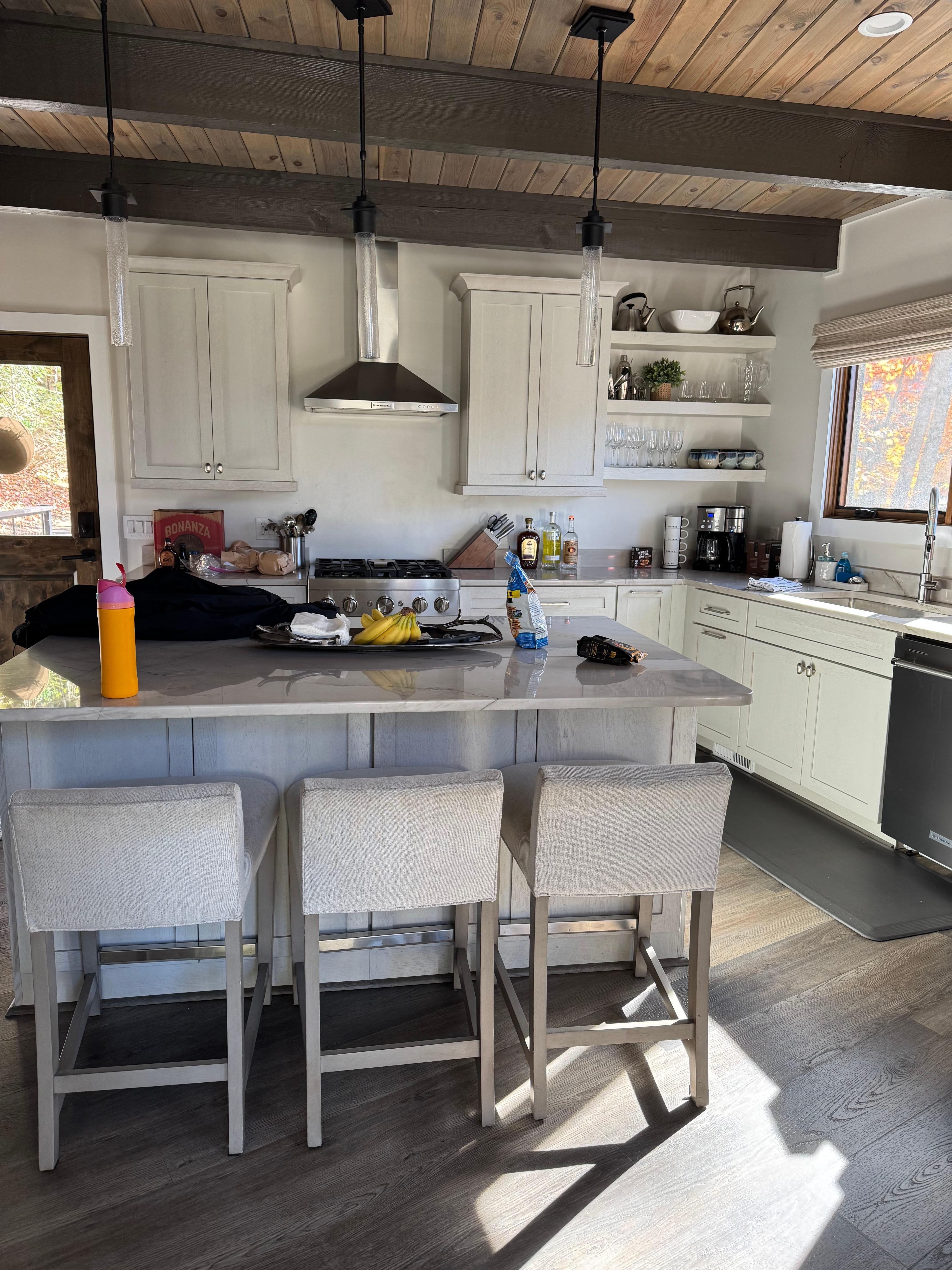 The kitchen is fully stocked with everything you need for a home cooked meal. Granite countertops, a coffee bar with multiple types of coffee makers which include drip coffee, K-Cups or French press, and stainless steel Kitchenaid appliances, make this kitchen an absolute dream!
