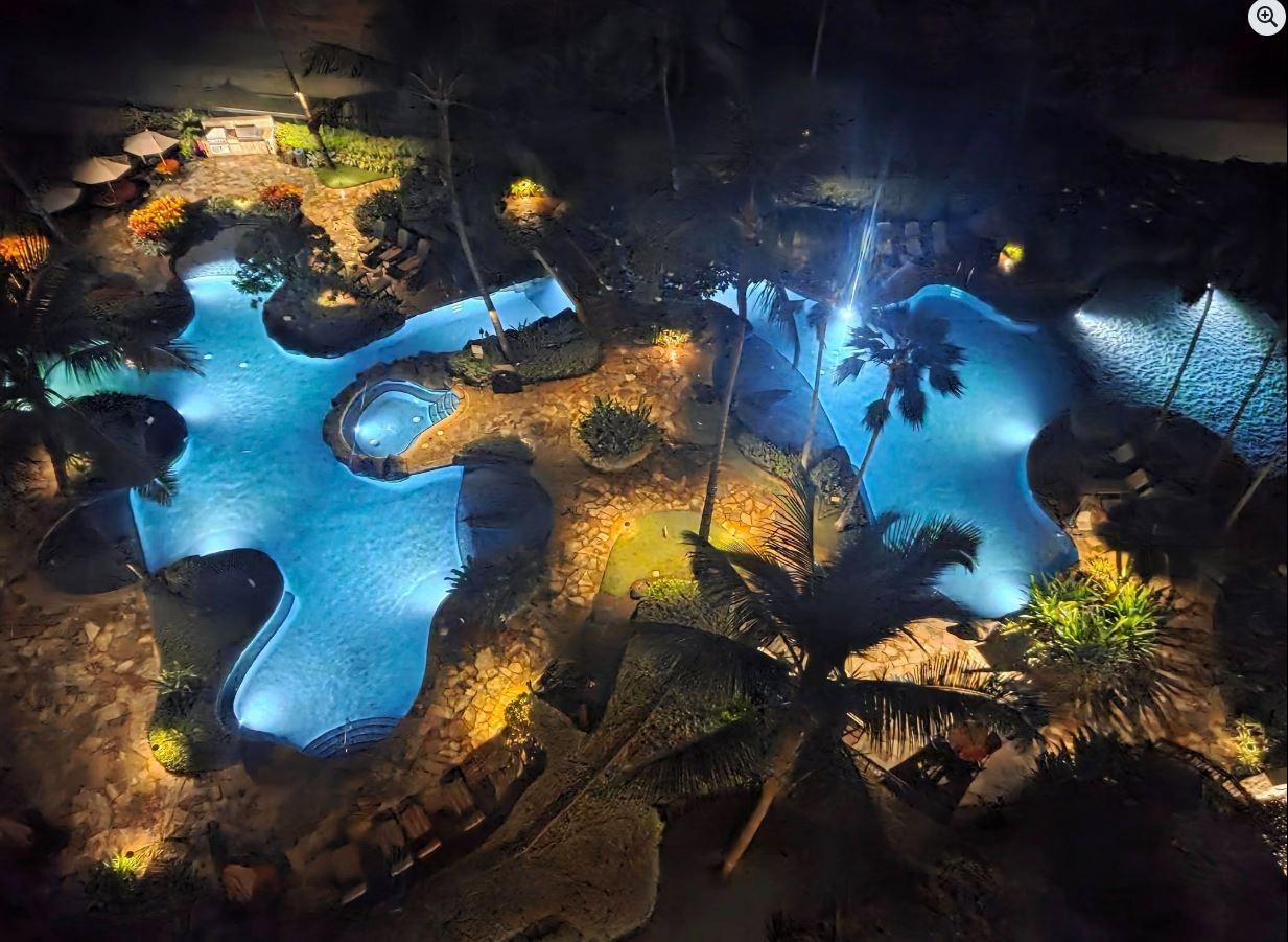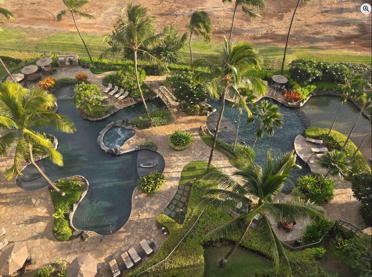 Du har totalt 1300 ft2 bostadsyta att koppla av i och njuta av inklusive en balkong pÄ 300 kvm. VÄr Lanai ser sydvÀst ut mot havet och stranden och har utsikt över lagunpoolerna, badtunnor, strandbar och BBQ-omrÄdet. Du kan slÄ dig ner pÄ vÄra bekvÀma utomhusstolar med stora storlekar, smutta pÄ ditt kaffe och titta pÄ valarna leka i havet, vinka till din familj vid poolerna eller njuta av en familjemÄltid som lyssnar pÄ ljudet frÄn vÄgorna och titta pÄ en underbar solnedgÄng. Det Àr verkligen magiskt.