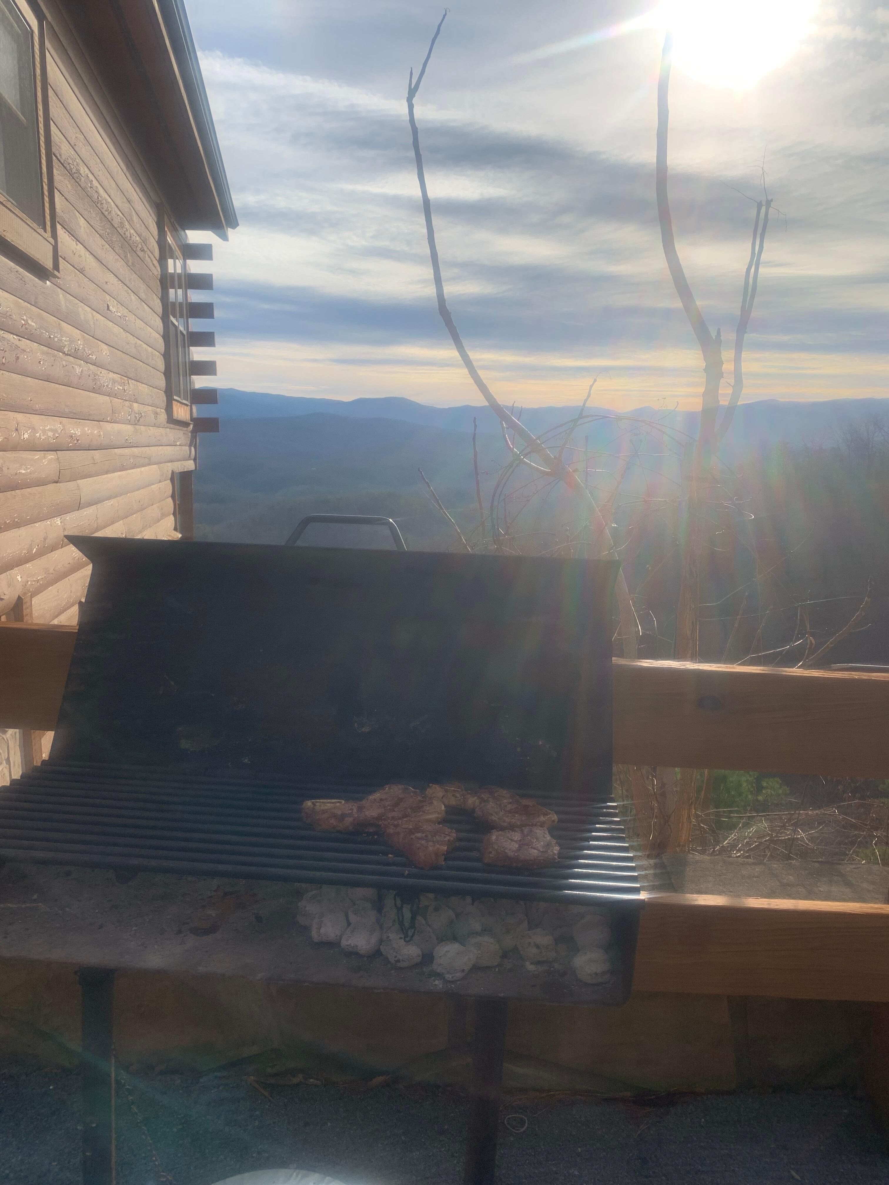 The unobstructed view of the Smoky Mountains is breathtaking. The cabin sits high on a hillside, so the covered deck almost seems suspended in midair. Thereâs nothing between you and the lush, green forests stretching away to the mountain peaks on the horizon. Sit in an old-fashioned wooden rocking chair, sip some iced tea or moonshine, and drink in that view. Enjoy the view while youâre soaking in the bubbling hot tub, too!