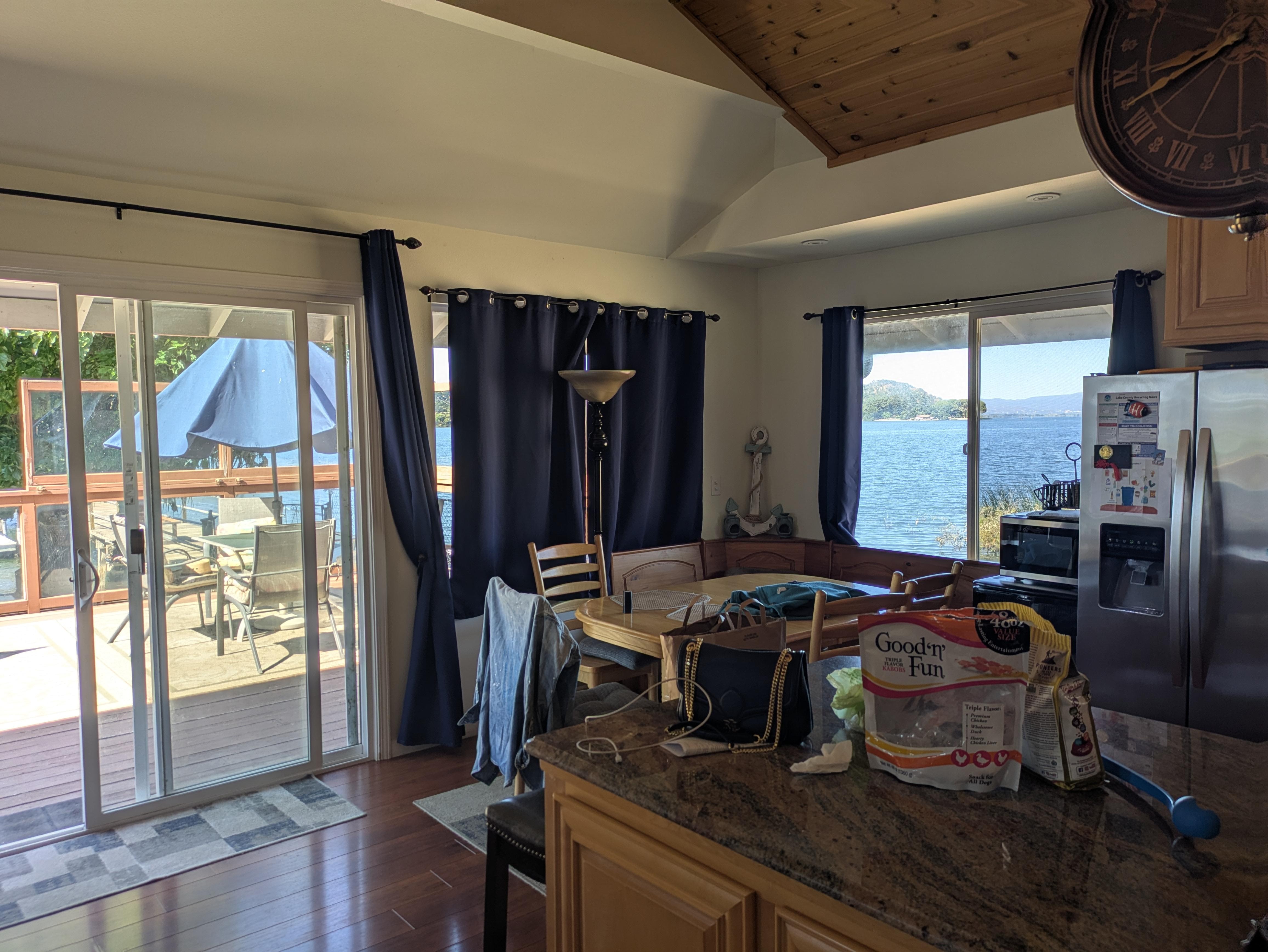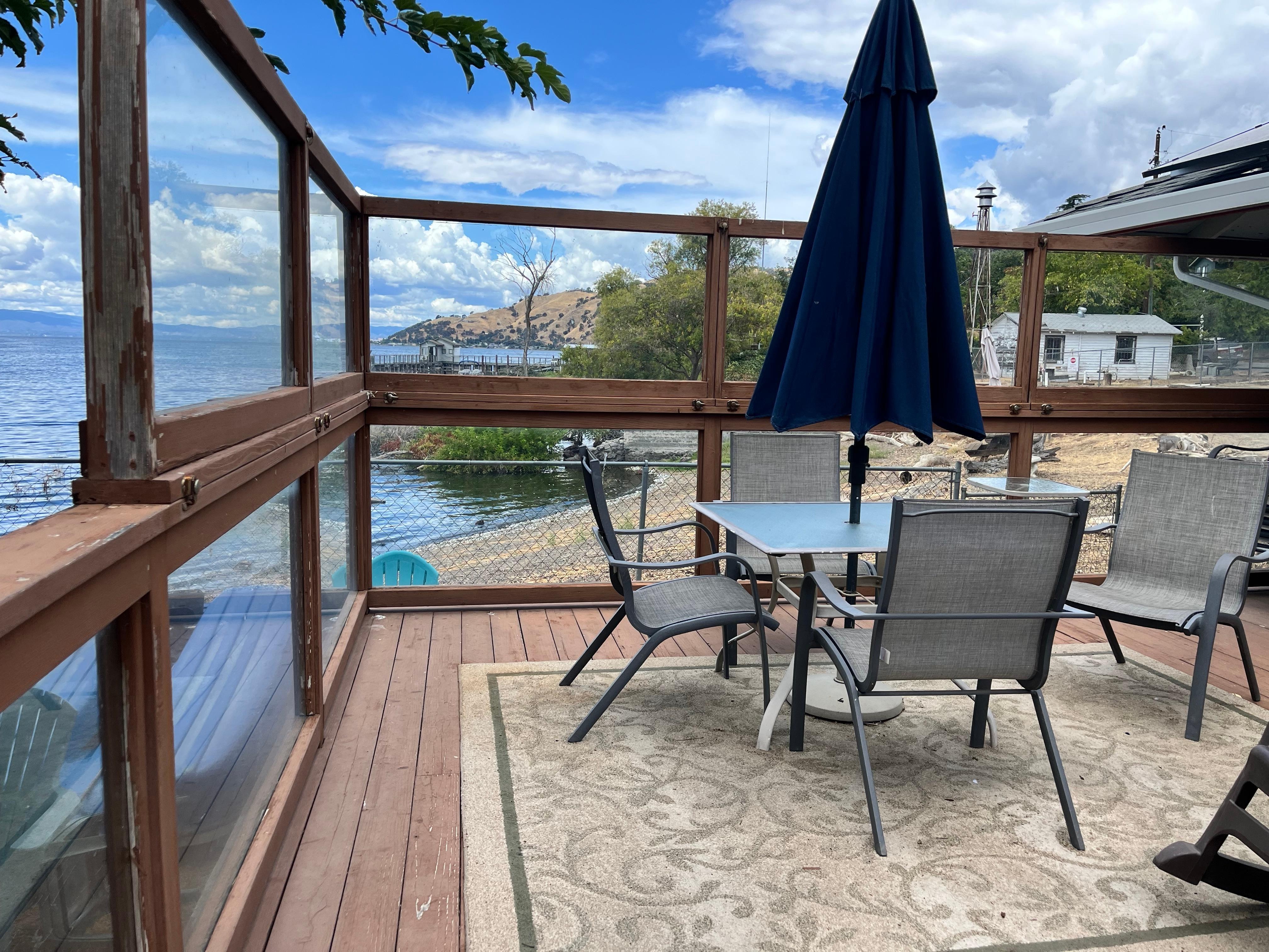 Stort fullt möblerat däck utanför huset med vacker utsikt över Mt. Konocti