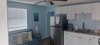 Place was great! We stayed in # 12. Had nice balcony to sit on. Cover parking. Clean, walking distance to a couple stores. Keurig coffee pot that makes cups or pot. Some pots and pans, glasses, plates basic house things.