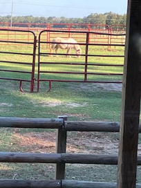 It's not every day that you can wake up with three beautiful horses and the friendliest cow on the planet greeting you just 20 feet outside your door. It's sweet!