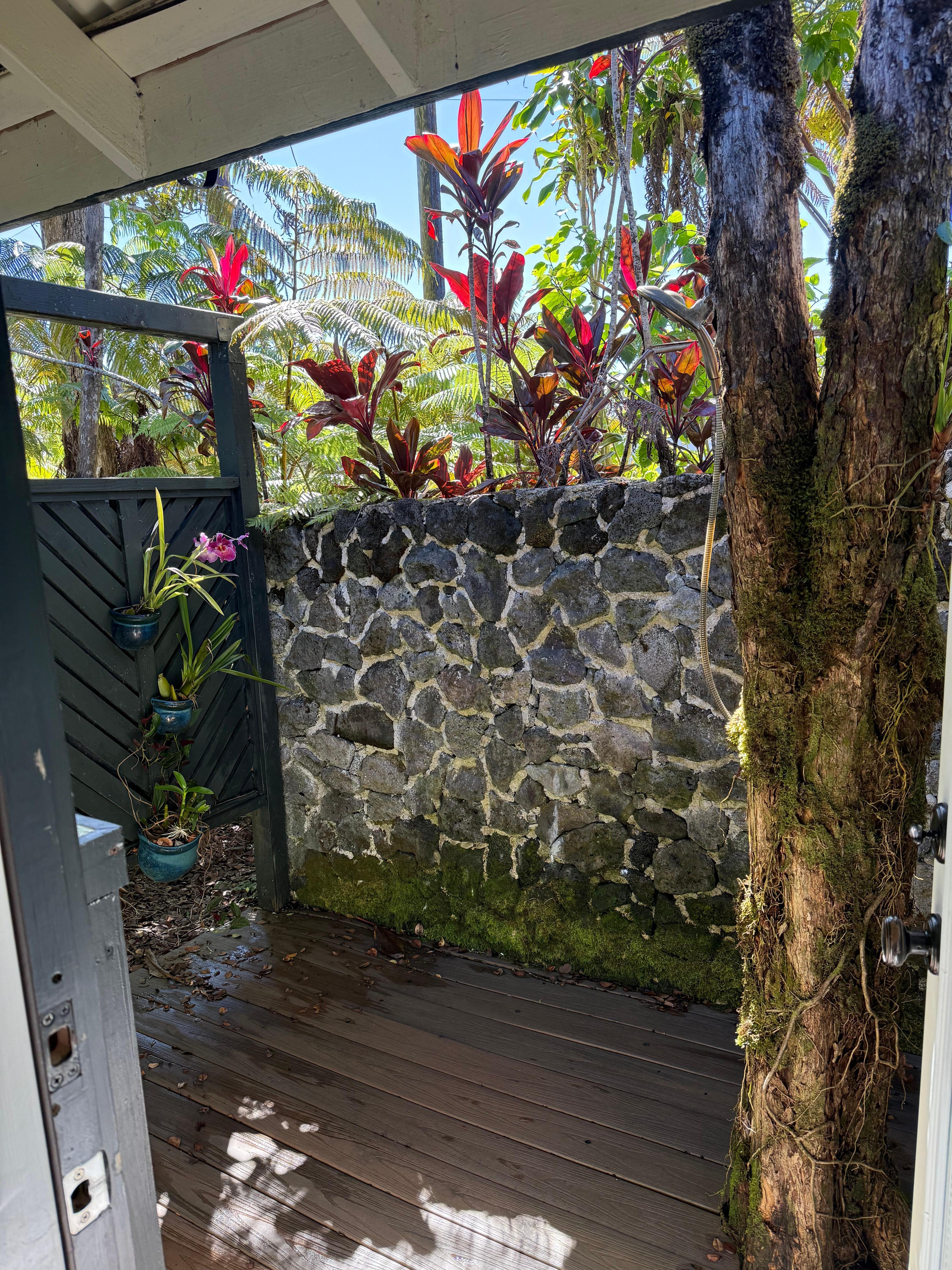 We loved our stay at this cottage in Volcano. The grounds and house were so peaceful and we absolutely loved the outdoor shower with the frog serenade. Great location for visiting Volcano National Park as well. Property was in excellent condition and clean. Communication with property manager was excellent as well. We thoroughly enjoyed our stay here and would not hesitate to recommend this place and would happily stay again. Thanks you for a great vacay!