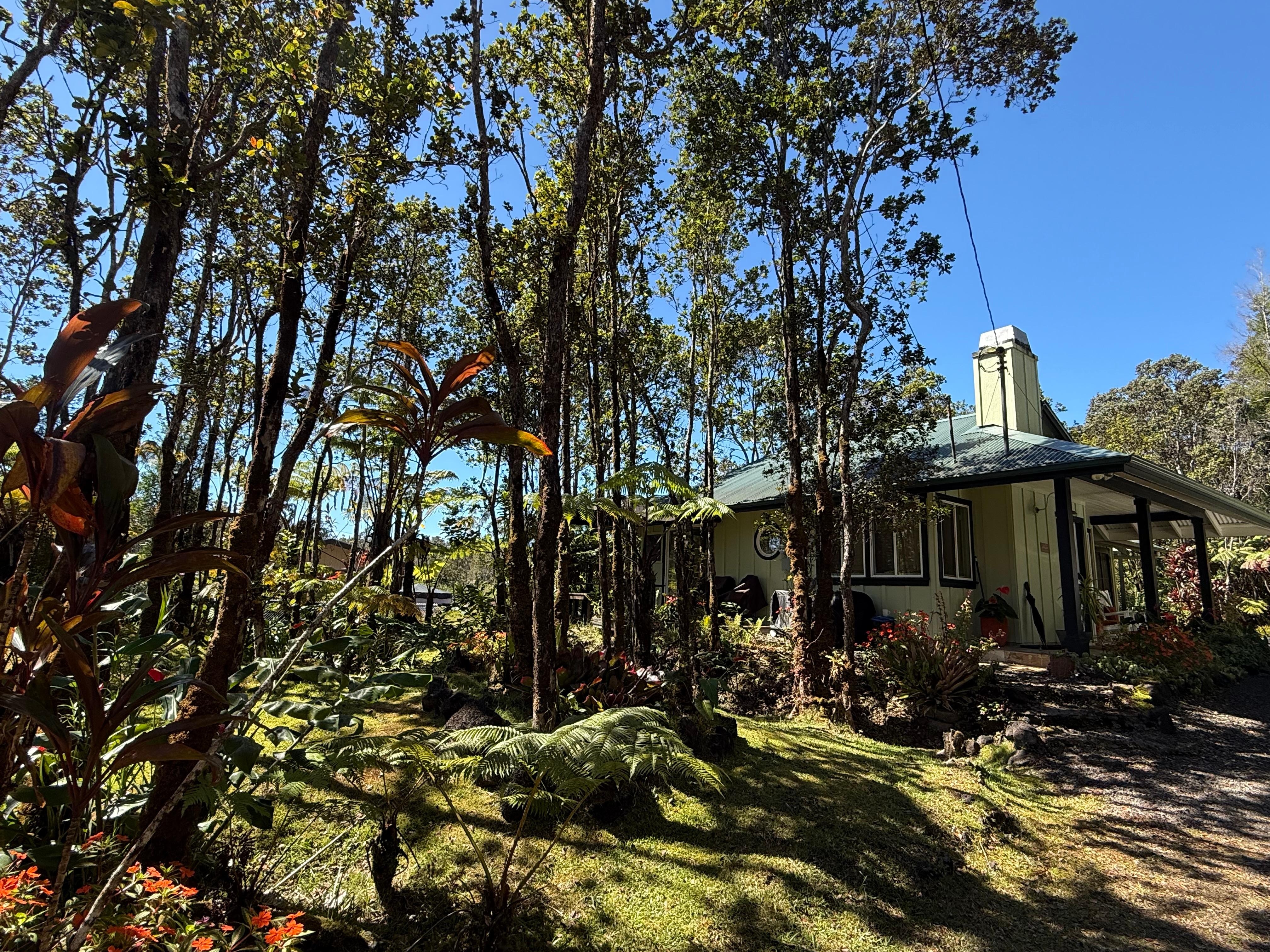 A garden oasis! This free-standing cottage is resting on gorgeous landscaped grounds with dense natural rainforest surrounding two sides of the home within a neighborhood setting. The subdivision is a mix of homes styles and ages with some newly constructed houses near by. The Plantation cottage although a newer build was designed with a vintage Plantation aesthetic with 1950s decor. Just a few miles from the Volcanoes National Park main entrance.