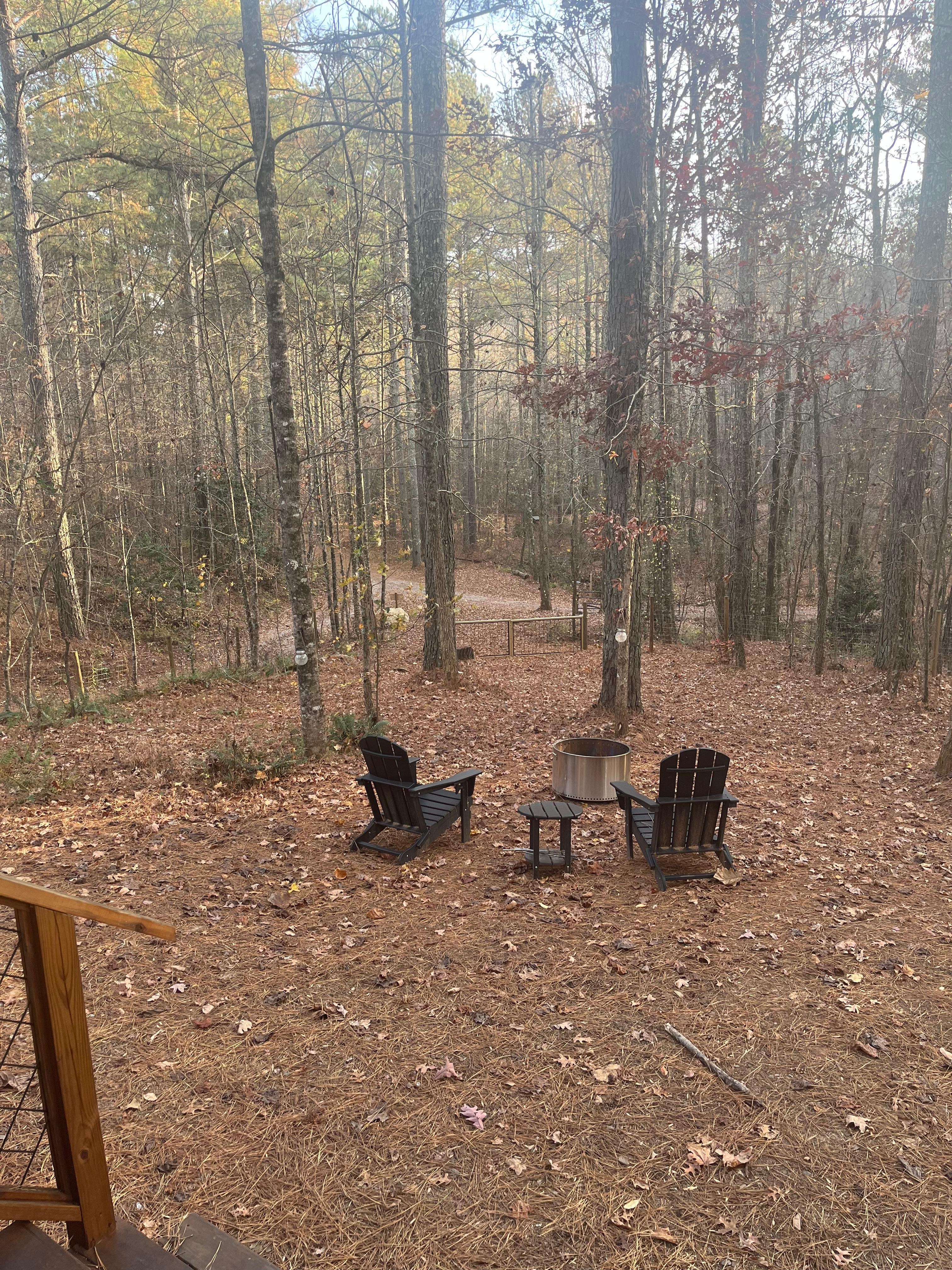 * Outdoor area with a smokeless fire pit/stove and Adirondack chairs