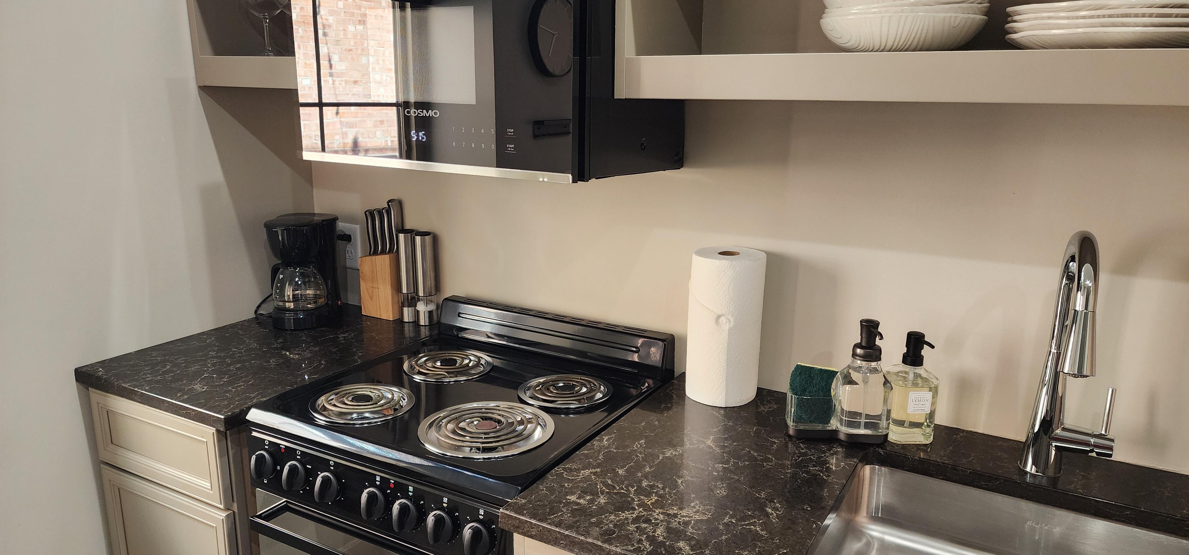 This dwelling has an outside patio adjacent to Henry Jâs, an upscale speakeasy cocktail bar.