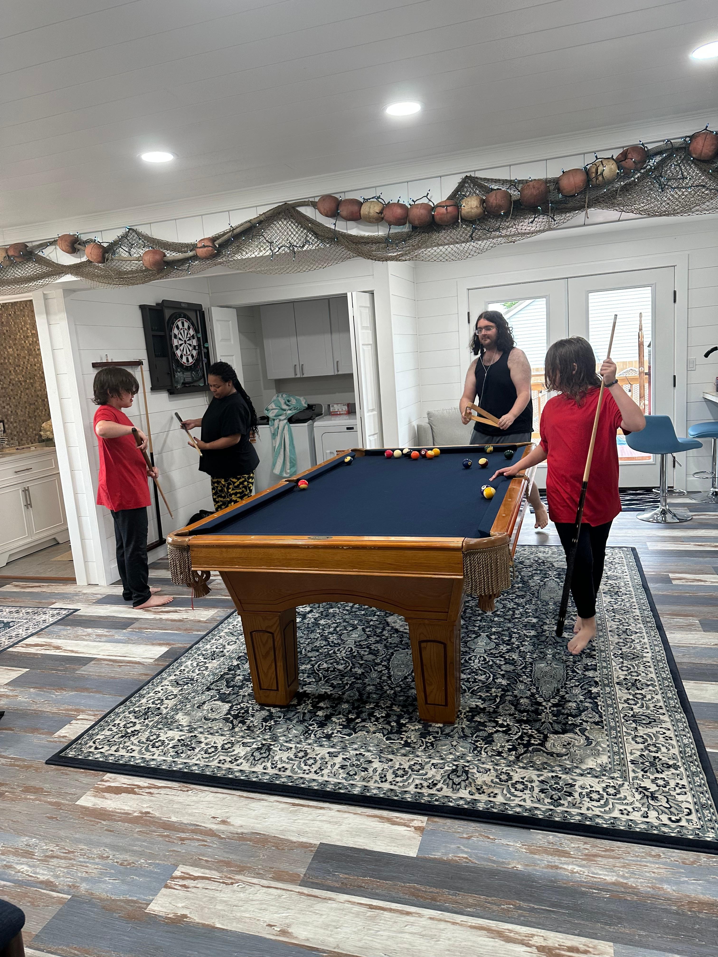 The layout of this home: The main floor - You enter front door into the grand entry with a spiral staircase. There is a living room area with a flatscreen TV and recliners for those who want extra comfort, a large dining room with seating for approx. 14 people plus a small bar area, kitchen area with a wall that is set up for a coffee/hot cocoa bar - center prep area with propane burners -electric oven with electric burners; you choose how you want to prepare your feast. There is a billiard room off the dining room - complete with billiard table and a flatscreen TV as well as a smaller size bedroom off the billiard area with a queen bed for those who prefer less stairs. There are French doors from the billiard room, kitchen and living room/breakfast table room to the expansive deck!!