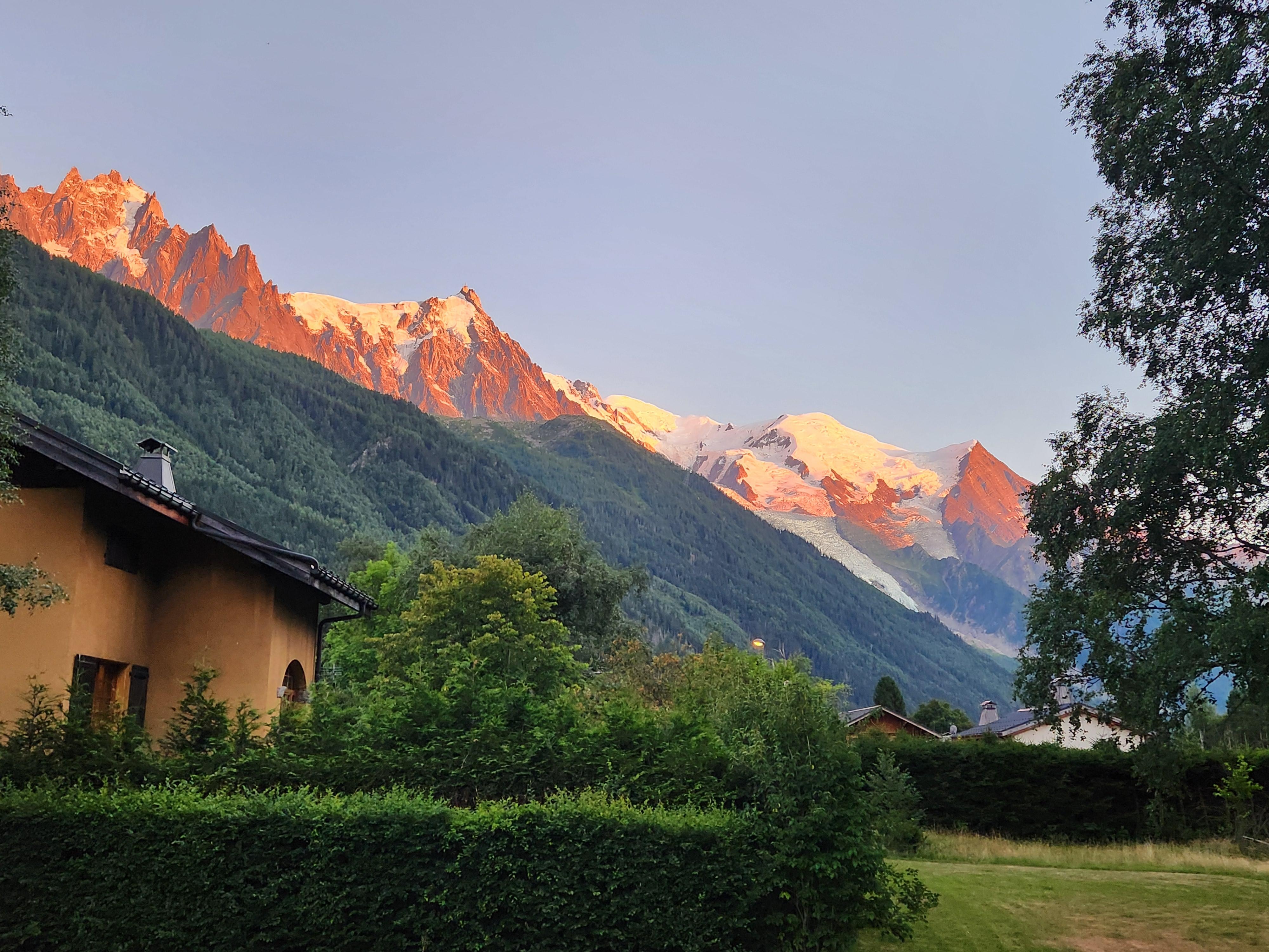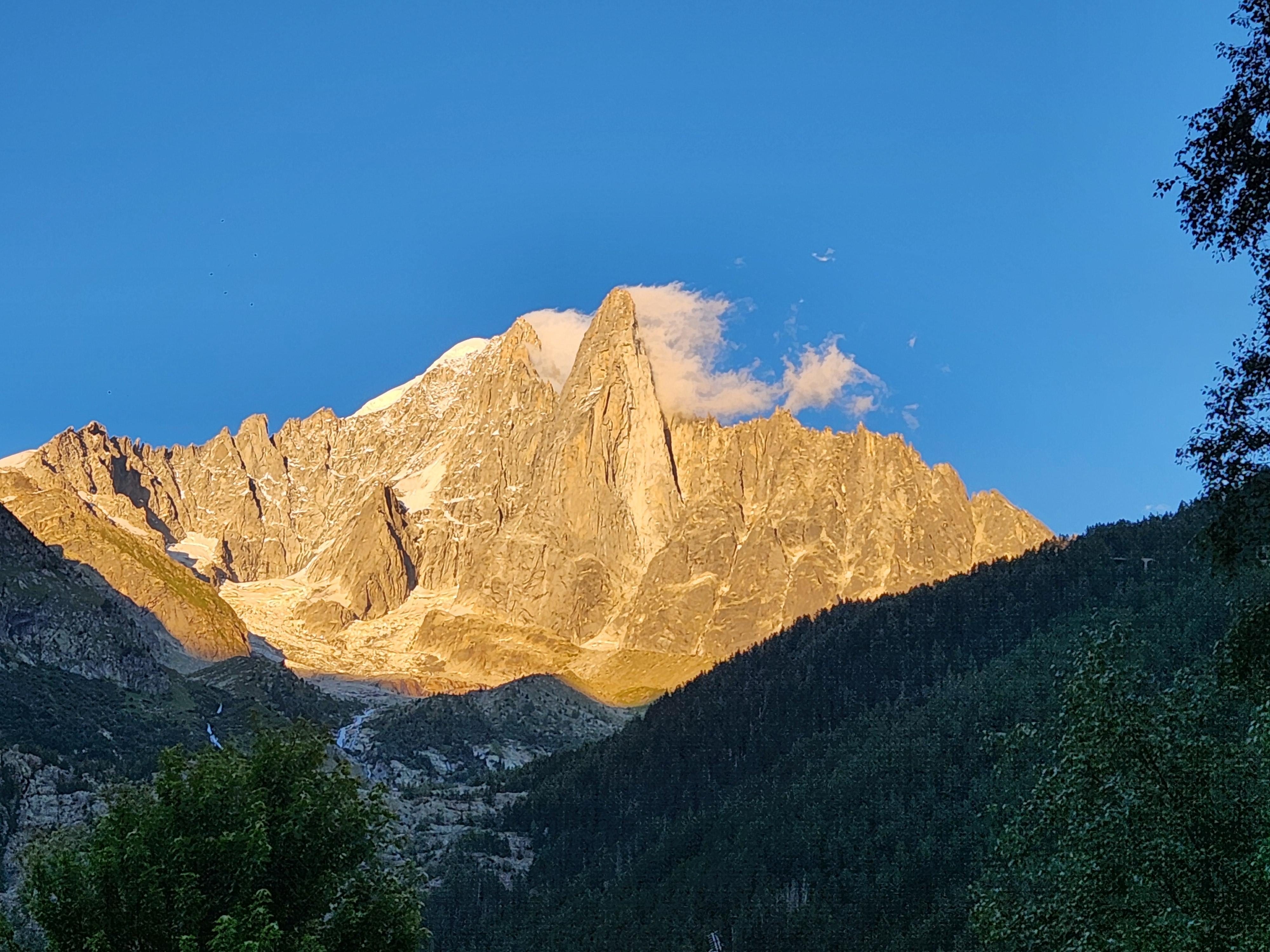 - exceptionell utsikt över Mont Blanc, Aiguilles de Chamonix, Aiguille Verte och Drus.