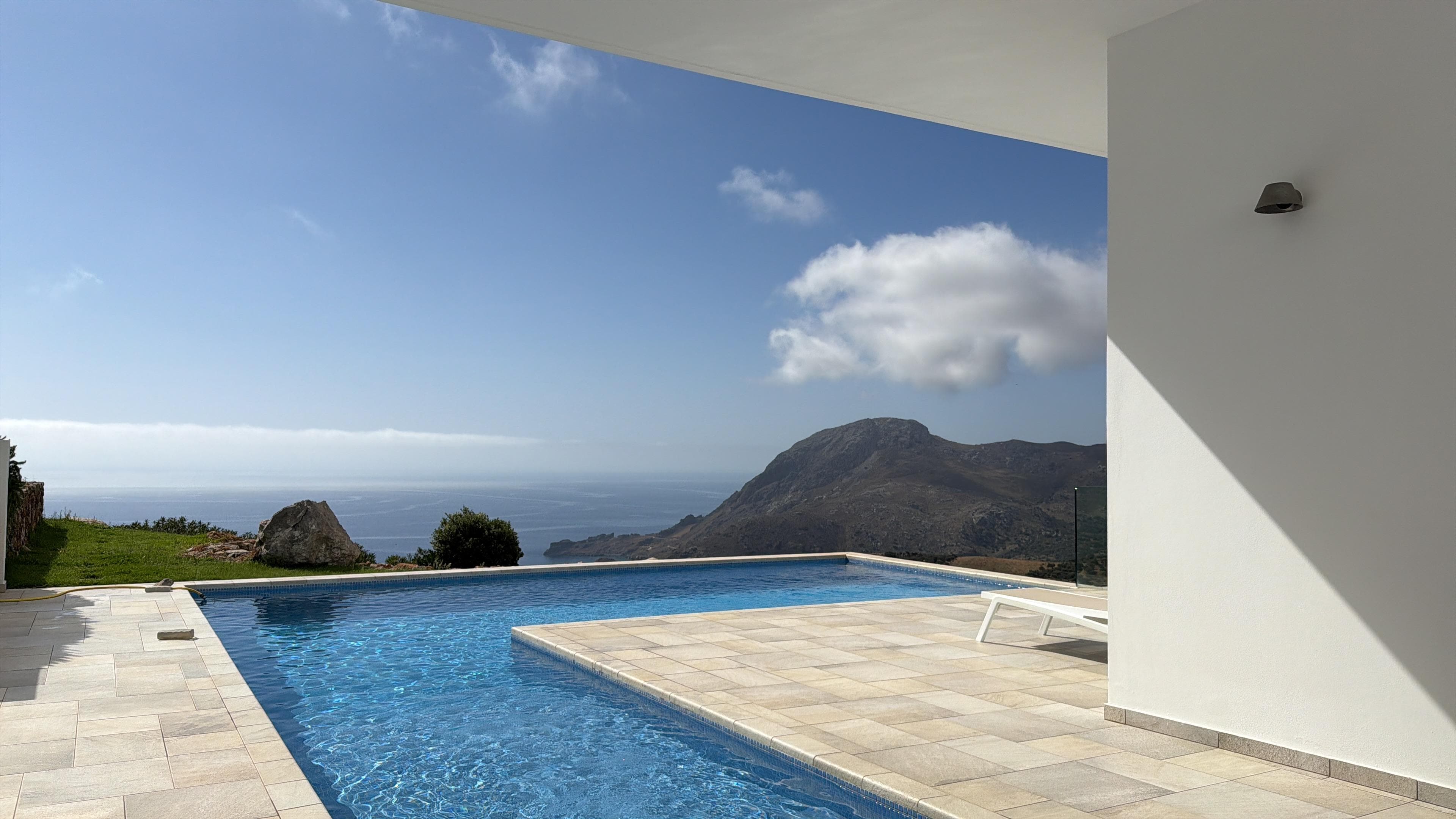 Huset Àr utformat för att skydda poolen och uteplatsen mot de varma men bekanta siroccovindarna som Àr kÀnda pÄ alla grekiska öarna. Den fantastiska poolen Àr idealisk för bÄde den sjÀlvsÀkra simmare och nybörjaren, den har ett grunt paddlingomrÄde med sÀkra graderade steg till huvudpoolen.