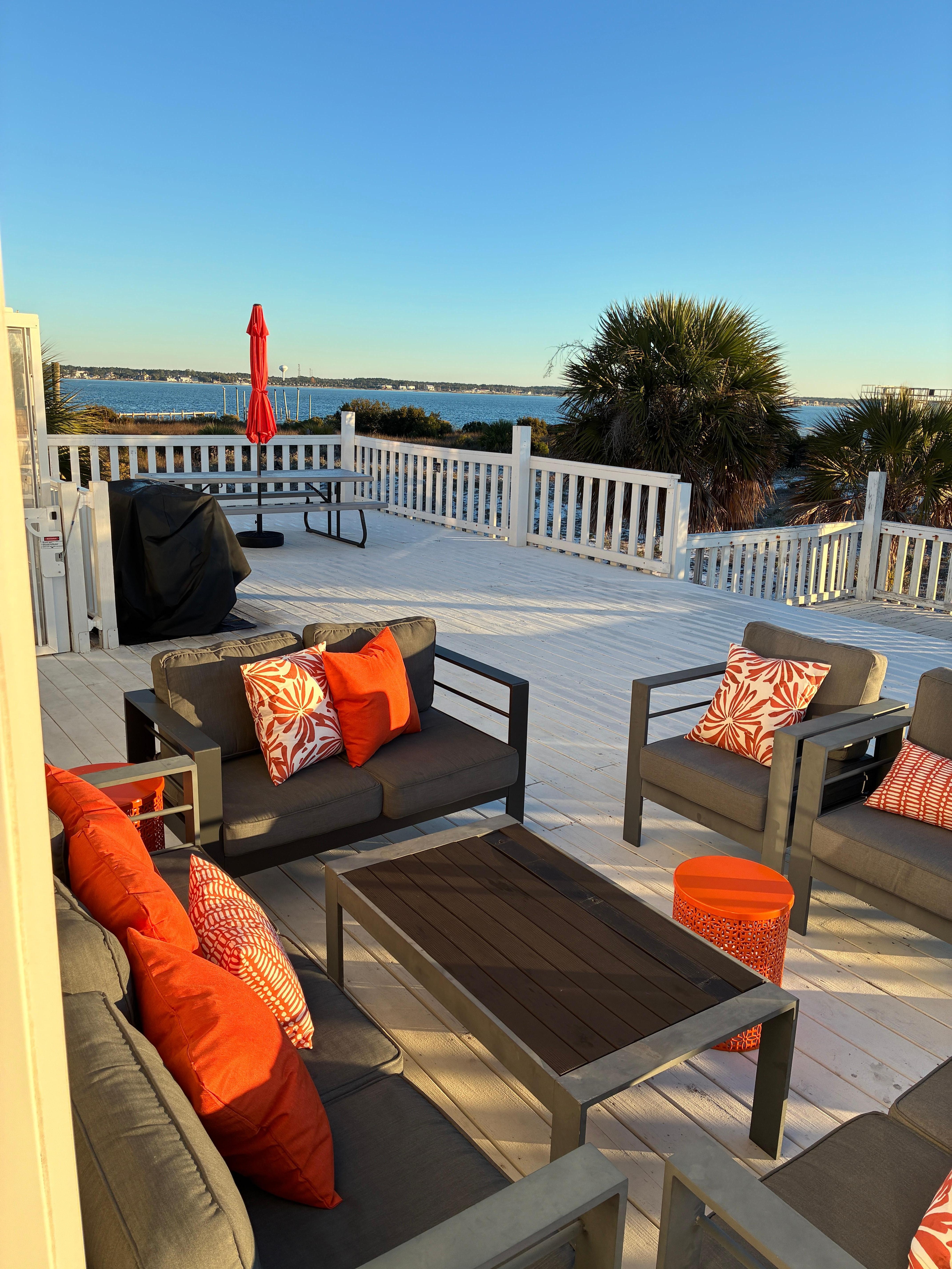 Discover Makarios Beach Blu, Navarre's hidden gem! This charming 3-bedroom, 2-bathroom beach cottage sleeps up to nine guests comfortably. The master bedroom boasts a queen bed and ensuite bathroom, while a king bed graces the guest bedroom, and the third bedroom features a full over full bunk bed with a twin trundle. Enjoy the convenience of tile flooring in the living areas and master bedroom, and plush carpeting in the guest bedrooms. Prepare meals in the well-equipped kitchen or grab a quick bite at the breakfast bar. Start your mornings with coffee on the back deck overlooking the serene Santa Rosa Sound, just a short walk from the beautiful beach. After sun-filled days, rinse off in the outdoor shower in the carport, which also offers a one-car garage and ample parking. This home features a durable metal roof with solar panels and includes a full-sized washer and dryer for your convenience.